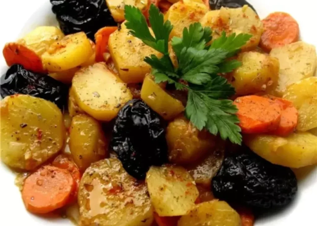 На сковороде обжаривается картошка вместе с черносливом. Добавляются соль, специи, затем блюдо надо накрыть крышкой и тушить около 20-30 минут. Можно добавить ложку сметаны, а также зелень по вкусу.