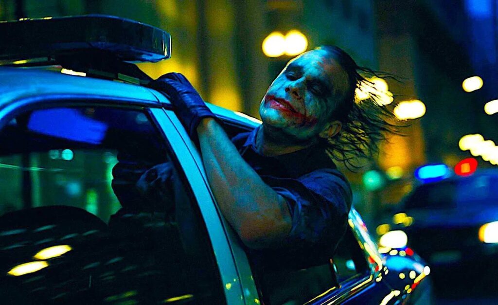 В фильме есть ещё один персонаж с необычным гримом. Это конечно же главный антагонист Бэтмена — Джокер. Его образ создавался традиционным способом, без использования компьютерной графики. За грим отвечал известный визажист Джон Кальоне-младший. Внешность героя должна была отражать черты неопределённости, поэтому макияж специально сделали таким небрежным и размытым. Кальоне вдохновлялся картинами Фрэнсиса Бэкона. Художник рисовал людей с нечёткой формой лица, из-за чего его картины выглядели безумными. Шрамы были сделаны с помощью силикона. Визажист фильма признался, что ему было крайне трудно игнорировать весь свой опыт и специально отправлять актера под камеры с таким неряшливым гримом.