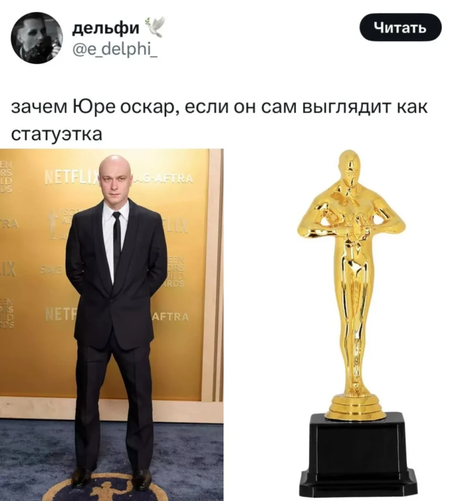 Все началось с церемонии «Золотого глобуса», когда российский актер с облегчением вздохнул, проиграв Кирану Калкину. Многие пользователи соцсетей решили, что Юра почувствовал облегчение, потому что не придется выступать с речью на английском — его языковые навыки стали темой шуток.